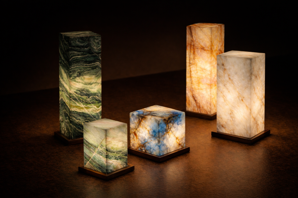 Die Höhe der Lampen beginnt bei 15 cm und ist in den Varianten 15 cm, 25 cm, 35 cm, 50 cm und 60 cm erhältlich. Als Material kommen ausschließlich lichtdurchlässige Steine zum Einsatz, wahlweise Patagonia oder Lumix Extra, die für eine besonders warme und hochwertige Lichtwirkung sorgen.